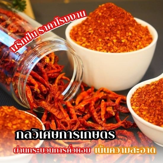 กลวิเศษการเกษตร เรามีโรงงานผลิตพริกป่น พริกขี้หนูป่น ทุกกระบวนการผลิตเรามีมาตรฐานที่ดี เเละมีการใส่ใจในทุกรายละเอียด โรงงานผลิตพริกป่นของเรา ผลิตขายทั้งในประเทศเเละส่งออกไปจำหน่ายในต่างประเทศ กำลังผลิตสูงกว่า 500 กิโลกรัม ถึง 1 ตัน ต่อวัน